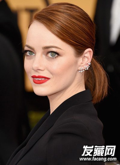 Emma-Stone的马尾辫很利索,露出精致的脸庞,气色粉粉嫩嫩哒。