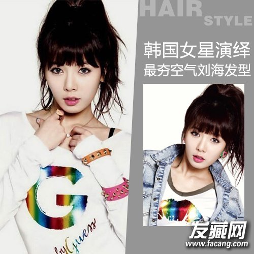 性感的泫雅的这款空气感扎发发型,简单地将中长发扎成一个高马尾造型,再配合这种清新的发色与微显蓬松的马尾,而清新的空气感刘海更是修颜显气质。