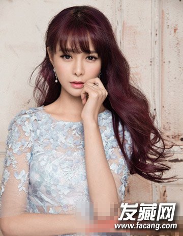 一款很显优雅妩媚风的沈梦辰造型,浪漫的及腰长发再进行简单的大卷造型设计,而染上的深色系的酒红色发色与清新的空气感刘海相搭更显优雅迷人范儿。