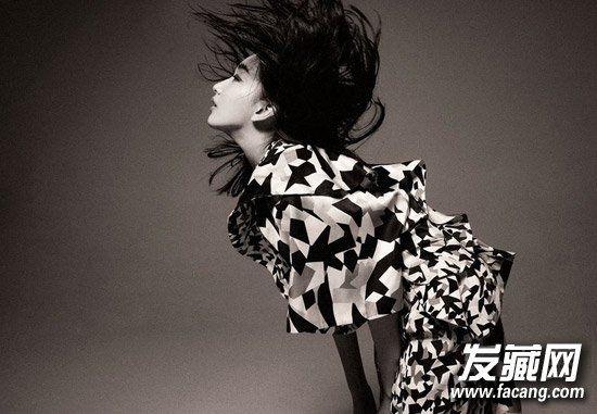 夸张写真造型,齐肩发在空中散开,黑白背景下,张扬个性魅力。