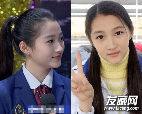 经典黑色长直发发型,校花的标配,直发扎成双马尾,露出清丽五官,很是惊艳,现实生活中上节目的样子有点显胖。
