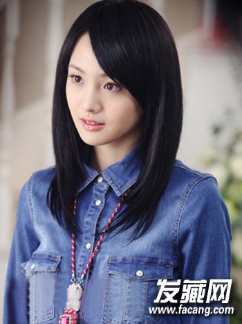 一头乌黑发亮的中长直发发型,自然的披散在胸前,内扣的发尾,搭配斜刘海下的清秀脸蛋,突显十足清新可爱范。