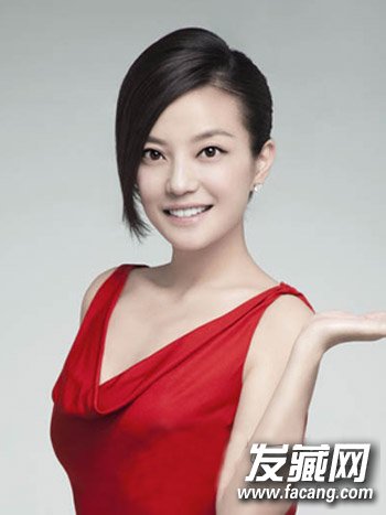 夏季怎么扎直发更显优雅风范呢?虎妈赵薇一头利落的斜刘海盘发发型,露出迷人的优雅笑容,搭配无袖的红色连衣裙,时尚又显气质