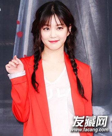 李侑菲的两根麻花辫扎得轻松随意,刘海也乡土气十足,鲜艳的大红色西装配V领T恤真是让人醉了!要不是年轻,要不是皮肤白,这个打扮真的很像农村小媳妇。