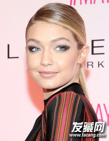Gigi Hadid的妆面则素雅很多,只突出了眼尾烟熏的晕染效果,低低的马尾扎起来,简洁中不失女人味。