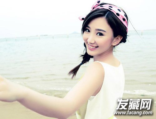长发随意变成侧编麻花辫,搭配斑点发带清新养眼,三七分长刘海显得五官更加精致。