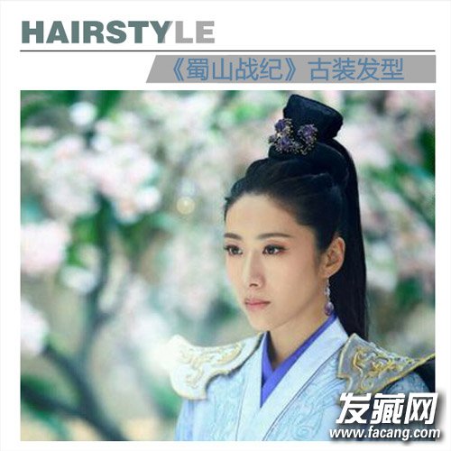 这款古装发型全部梳起束成马尾,部分长发盘成一个高髻,其余长发直发全部披下,佩戴上一个紫金钗和耳环,显出人物的沉稳和睿智。