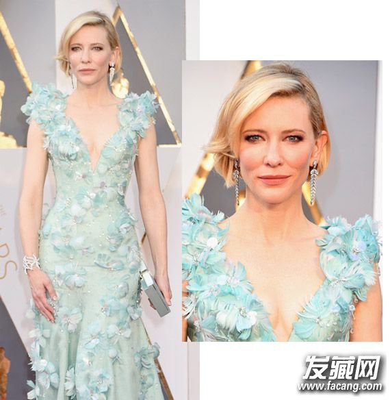 女王凯特布兰切特的盘发发型,斜刘海低盘发搭配花朵裙仙到不行呢!小清新的绿色减龄又衬肤色。