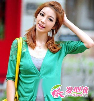 刘海后蓬的清爽发型,马尾是耳朵后面扎出,大耳环和金棕色发束,造型更活力动感。松散随意一些,自然大气,可爱俏皮。