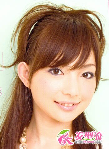 这是一款发梢极具动感的半盘发流行长发造型。高高束起的头发使发束和发梢容易散开。优雅散开的发梢是最佳的装饰。