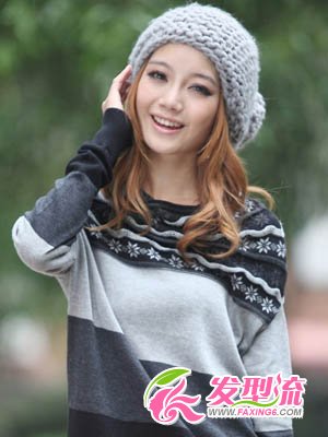 甜甜的公主气质卷发,将自然散落的卷发用帽子搭配出自然而又层次感,让你身上的女人味倍增。帽子掩盖起刘海让额头完美的展现出来,这样五官就更显得清晰灵动。灰色的毛衣和帽子呼应,很俏皮阳光。