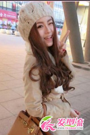 很独特的一款长卷发,顶部至肩膀出是柔顺的直发,肩膀以下开始打造大大的卷,看起来非常有弹性,给人调皮可爱的感觉。卡其色毛线帽子搭配卡其色长款修身风衣,时尚味儿十足。