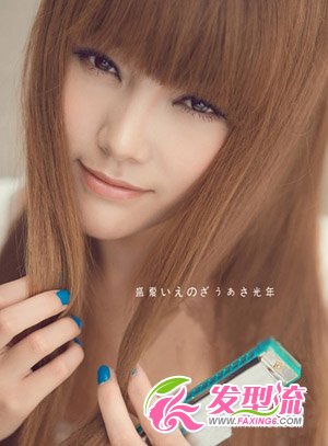 齐眼帘较长的齐刘海遮盖住额头,露出精致的妆容和立体五官,很有杂志模特的风范!头发利用时尚的奶茶系染发让女生的肤色显得更加的白皙健康有光泽,整体效果看上去非常的灵动超出自然的feel,蓝色指甲很抢眼哦!
