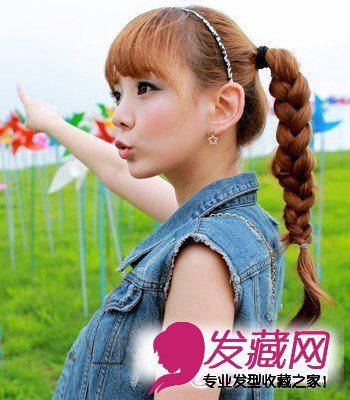 很可爱的一款马尾发辫扎发,小编也很喜欢哦!春夏季节利用扎发来迎合气氛,真是一个不错的选择!将发辫编织的较为松散,显现出女生随意的个性。轻薄的刘海下一双明亮的眼睛闪烁着动人的光芒,嘟起小嘴的动作更加可爱。