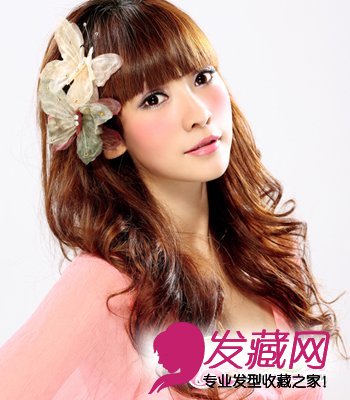 利用发蜡涂抹在卷发上,让发丝充满丰富的弹性,看起来更能给人一种散发生命力的感觉。此款刘海较为轻薄,以此来映衬波浪卷发。利用漂亮的蝴蝶头饰点缀在发型上,显现出春天浪漫的气息,整体造型都感觉很是唯美哦!