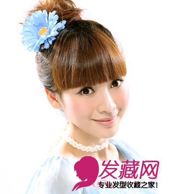 日系风十足的丸子扎发,让柳岩显得更加俏丽、清新。将所有发丝收拢后扎在头顶,利用蓝色系花朵点缀在发髻上,以此来增加发开型的抢眼指数。这款极具春夏风情的扎发,很是清新人见人爱!让你成为清爽系的视觉女生。