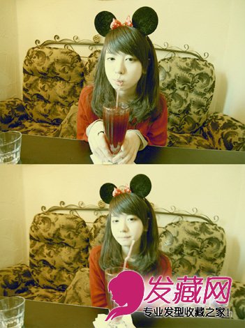 斜刘海的内扣中长发发型。在中长发发型中,内扣的发型是非常流行的种类之一。不但可以修饰脸型,也让整体尤为生动。再配上米奇的装饰物,真的是超可爱的呢!