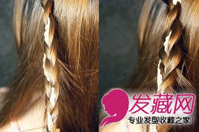 步骤2:编至发尾处,不用全部编完,用皮筋固定好。编好后的发辫抽松一些。另一边也编出同样的蕾丝辫子。
