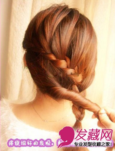 将旋扭好的发股,朝编好的麻花辫绕去。