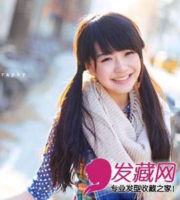 甜美的齐刘海长发扎可爱的双马尾辫发型,刘海发丝修颜可爱,清新的蓝色系穿搭搭配米白色围巾,很清新的初秋甜美造型!