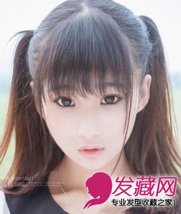 日系萌萝莉范儿双马尾辫发型,齐刘海长直发扎高马尾,挑染浅咖色发丝清新,齐刘海修颜萌动。