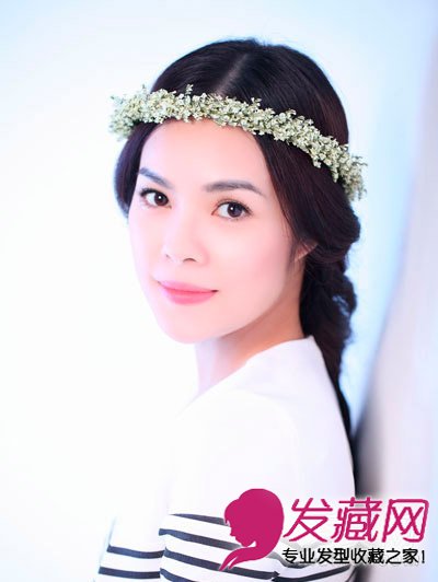 中分长刘海沿着耳朵自然摆落向后方,缠绕出唯美别致的纹理,更能巧妙修饰脸型,搭配上一顶花环,清新而唯美,这样的你怎么不让人喜爱呢?