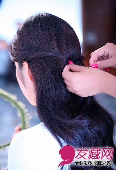 step4:右侧重复同样步骤,再将两束头发并在一起固定。