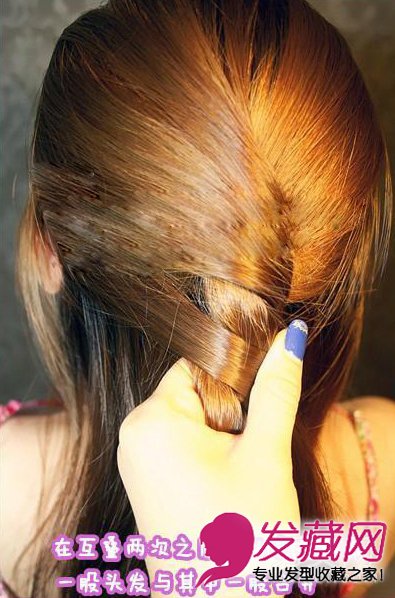 在互叠两次之后,从左后取出一股头发与其中一股合并。