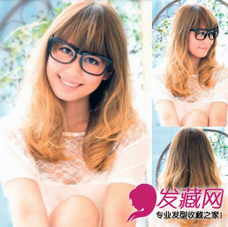 长发式梨花头照样甜美可人,膨卷的发尾拉长了脸型,使脸蛋不再肥嘟嘟。金黄底色混杂挑染的黑色使造型不显突兀。