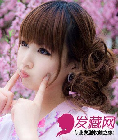 日系的盘发造型是很多小萝莉最爱,棕色挑染的长卷发扎这样的侧边发髻,发卷带来丰富的造型感,搭配修颜的齐刘海呆萌可爱。