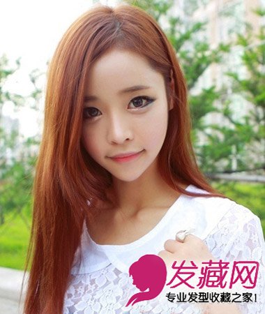 棕黄色的染发颜色,既增加了直发的时尚魅力,又将女生的肤色衬托的更白皙亮丽,长斜刘海发型设计,弥漫着甜美可爱的淑女气息。