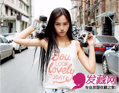 及腰的长发甜美优雅,轻薄的感觉很是透气清爽,中分的发型设计让MM告别夏日刘海的困扰,更显清凉。