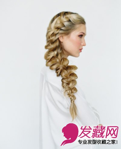 侧面效果 蓬松的辫子堆在肩头很有视觉冲击力,金黄色的蜈蚣辫编发就像洋娃娃一样可爱迷人。