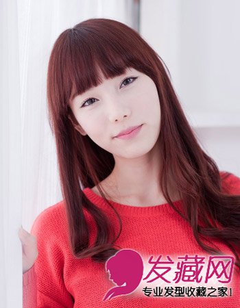 时尚的酒红色染发发型加上一款齐刘海的长卷发造型,十分修饰妹纸的脸型,也有很好的减龄效果哦!是一款适合修饰脸型长发发型。