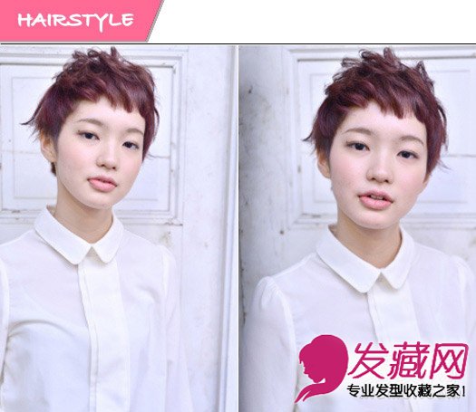 朋克风的酒红色发型,向上堆起的刘海,两鬓的头发推剪的很短,露出精致的五官,时尚帅气又有型。