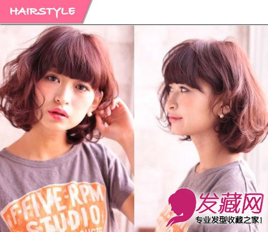 短发蘑菇头发型,甜美可爱,内扣的齐刘海修饰小脸,卷烫的头发让头发看上去丰盈有型,酒红色的染色衬托白皙肤色,时尚有个性。