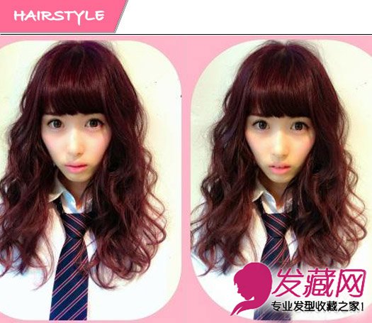 酒红色头发让女生看上去拥有瓷娃娃般的肌肤,而且齐刘海蛋卷头也让女生看上去甜美可人。