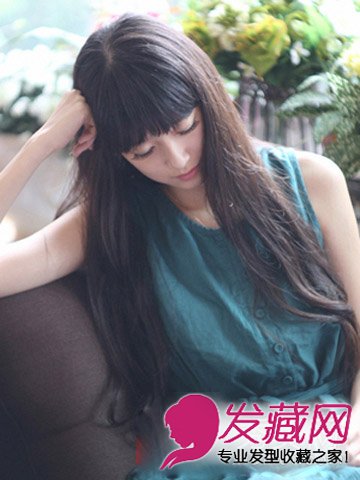 超百搭的一款齐刘海直发,简单的乌黑长发自然披肩,搭配齐刘海修饰出精致小V脸,随意搭配墨绿色连身裙就很有清新气质。