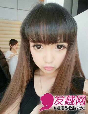 大大的眼睛化浓妆更显可爱娇俏,简单的齐刘海长发发型,清纯修颜,小萝莉感尽显。