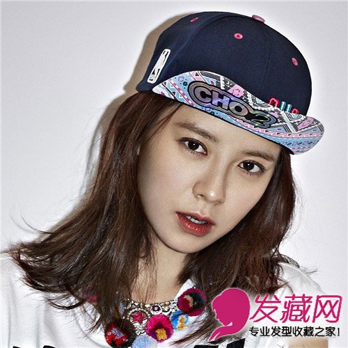 同样帽子造型的宋智孝,一头深棕色的过肩发,在发尾处有外翘的处理,显得整个人非常俏皮,此款发型的亮点在于帽子,内鸭舌有非常丰富的色彩,使整个人更加靓丽。