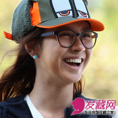 而同样用眼镜修饰的宋智孝,没有任何眼妆,卡通造型的鸭舌帽与黑框眼镜更是搭出了阿拉蕾的效果,与baby的时髦相比,宋智孝显得可爱俏皮。