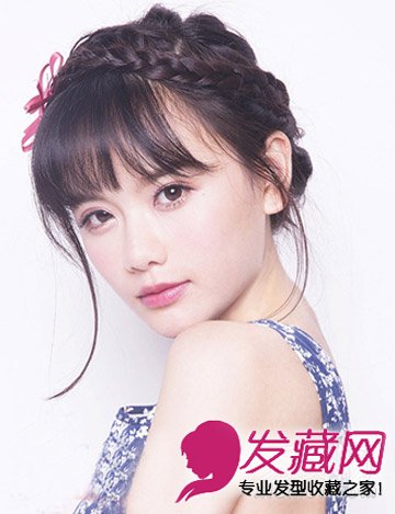 将一头及腰长发在发间取一束头发,编上麻花辫盘在这款发髻上,精致乖巧,配上齐刘海更显娇俏萝莉气质。