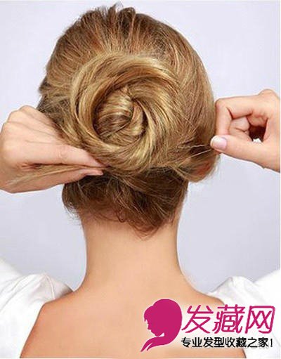 同样,将右侧的发束从左下方缠上去,用小卡子固定好。细碎的头发都用卡子藏起来,整理好。