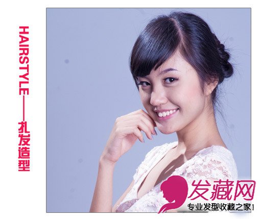 高耸的盘发展现出优雅端庄范儿,斜刘海修饰脸型,甜美有气质。