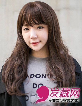 碎发的刘海搭配蓬松的长卷发,再加上深棕色的染发,起到很好的修颜减龄功效,完美展现美眉第一张精致小脸,很潮的一款韩式长发发型。