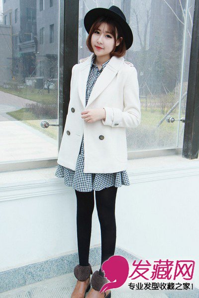 韩式短发发新风格,浅色的染发搭配帽子很显精神,白色外套加格子连衣裙的搭配清爽迷人。