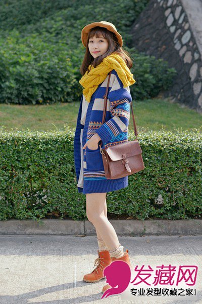 鲜艳的黄色和蓝色也是冬季的常见色,给人一种很温暖的感觉,像这样做一款烫发发型,弄个空气刘海,再搭配长款毛衣和围巾,很是温暖治愈系。