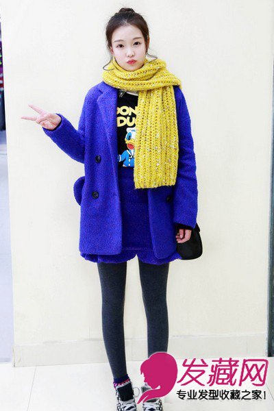 清爽的丸子头扎发发型,甜美的束发加上两颊边卷发修饰超显可爱感,宝蓝色的呢子大衣,搭配黄色的围巾更加娇俏可人,好温暖的感觉。