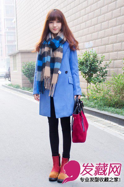 时尚OL很爱的一款造型搭配,短靴、长外套,甜美的齐刘海卷发,裸色和条纹的搭配增添时尚感。