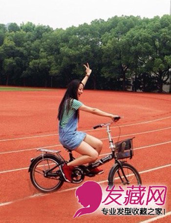 操场骑单车的谢贝梅,披肩发型,背带裤T恤,散发出可爱的学生气。